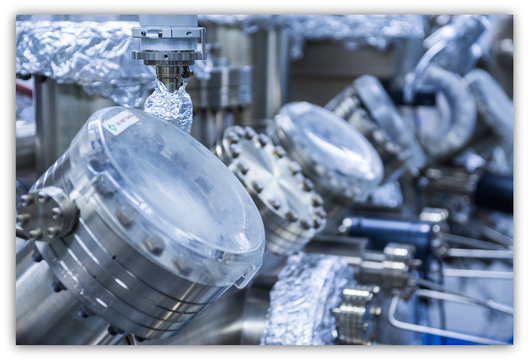 本装置真空チャンバー内で金やアルミニウムといった金属の塊に電子線を照射して加熱し、蒸発させることで金属薄膜を作製します。 この装置には、利用頻度の高い蒸着作業の高効率化のために、クライオポンプを搭載することで、排気速度を向上しています。また、トンネル接合やナノ接合を作製するための基板角度可変機構を搭載し、多様な実験プロセスに対応しています。